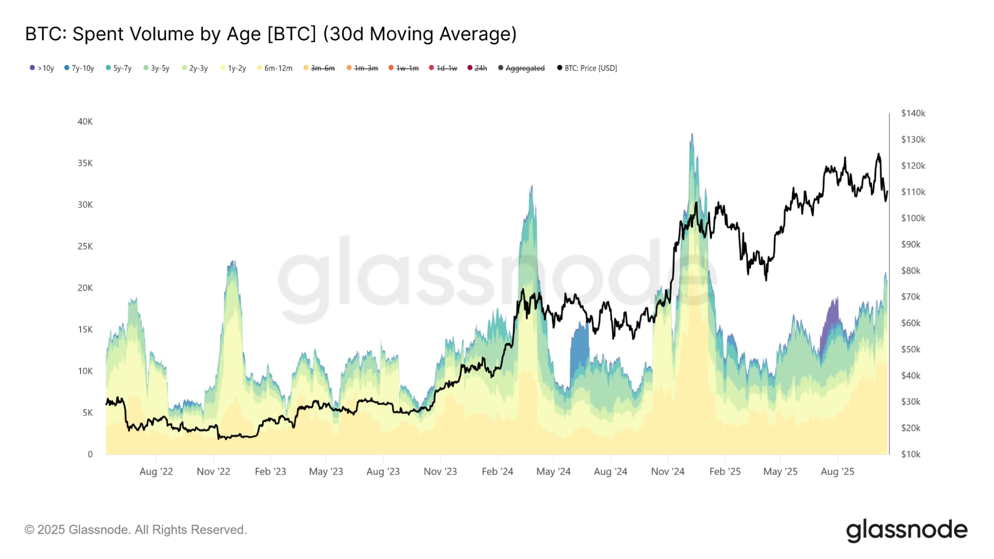 The above chart shows an uptick in spent volume by long-term holders, indicating that more Bitcoin OGs are selling the token after holding it for years, noted by the purple and blue colors in the chart. The chart reveals periods of heightened activity where older coins were spent; there is a significant uptick in spent volume when BTC is above $100k reinforcing the idea that Bitcoin’s OG holders are unloading their positions at current prices.