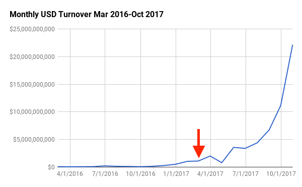強調表示されている部分、 2016 年 3 月における XBTUSD の取引高は 1,600 万ドルでした。XBTUSD は現在多いときにはわずか 1分間でその 2 倍が取引されます。