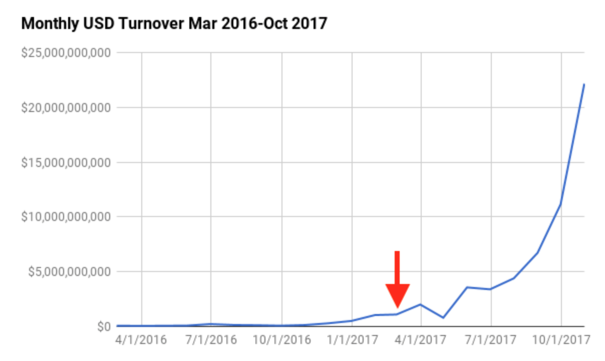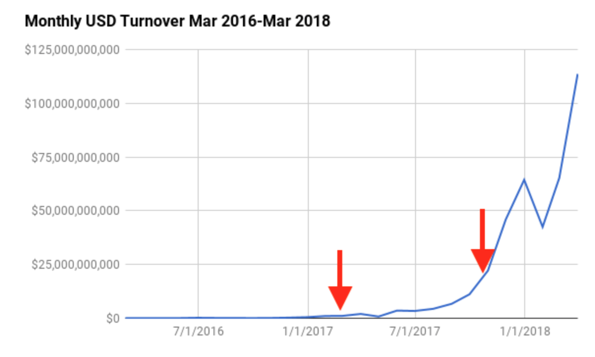 现在,是时候回归到文章的标题了。 BitMEX 现在每天的交易额高达 65 亿美元。我们前一分钟交易纪录是 3,500 万美元,这个数字高于 2016 年 4 月的整个月份。